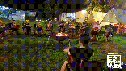 篝火在静谧的黑夜中闪耀着光辉,绚烂美丽小朋友们围着篝火,与自己的孩子尽情地欢拍打非洲鼓,演奏一首动听的音乐~
