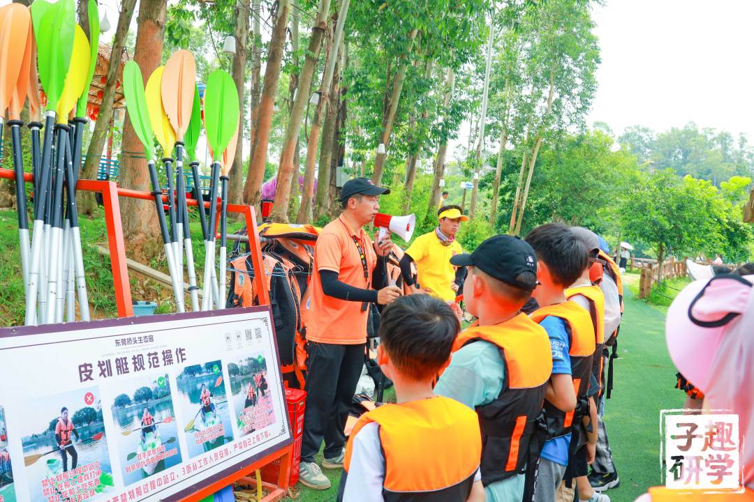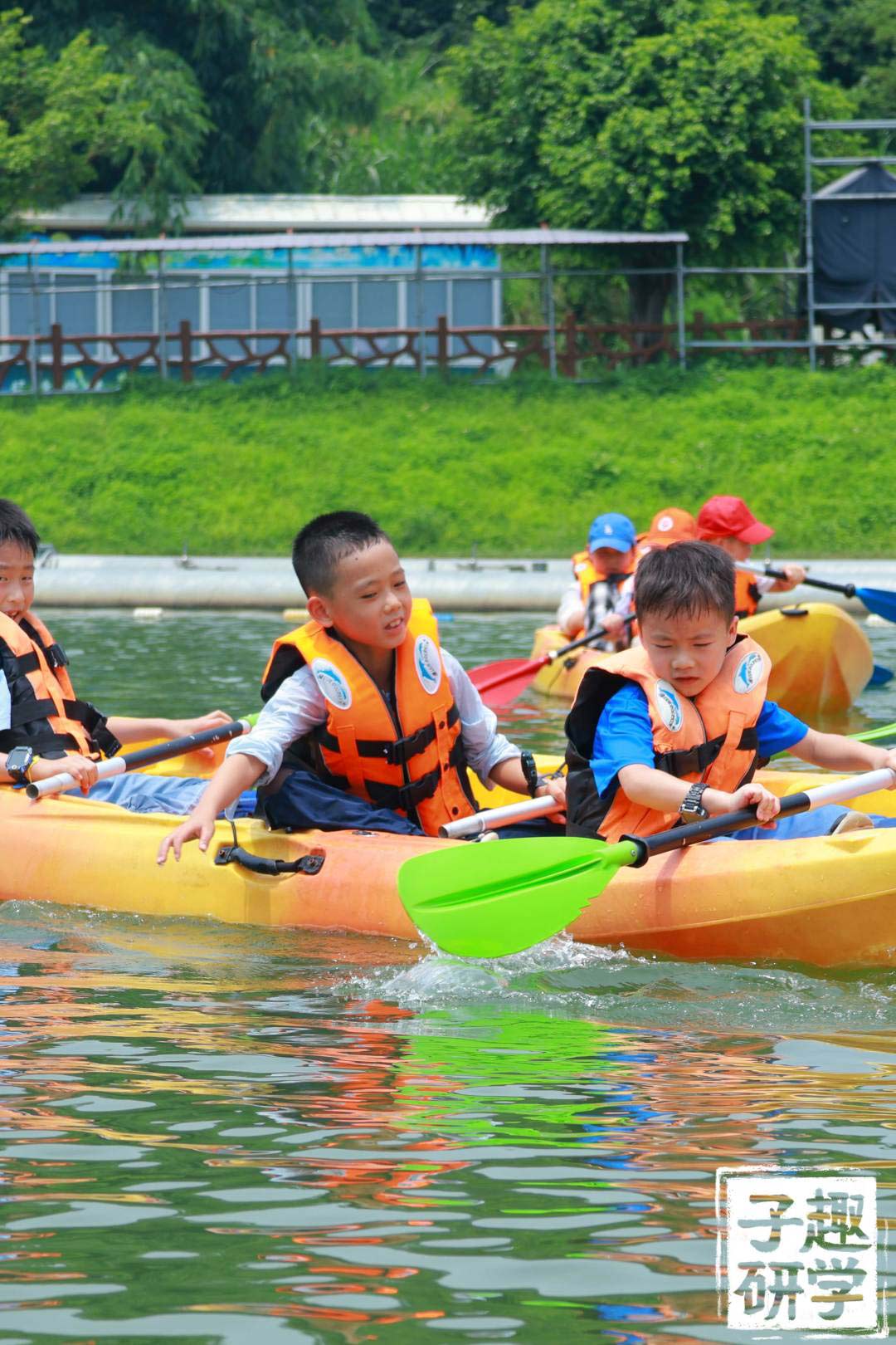 宝贝们在教练的指导下,很快就领悟了前进、后退的技能。穿上救生衣,宝贝们三两结伴一起划船。