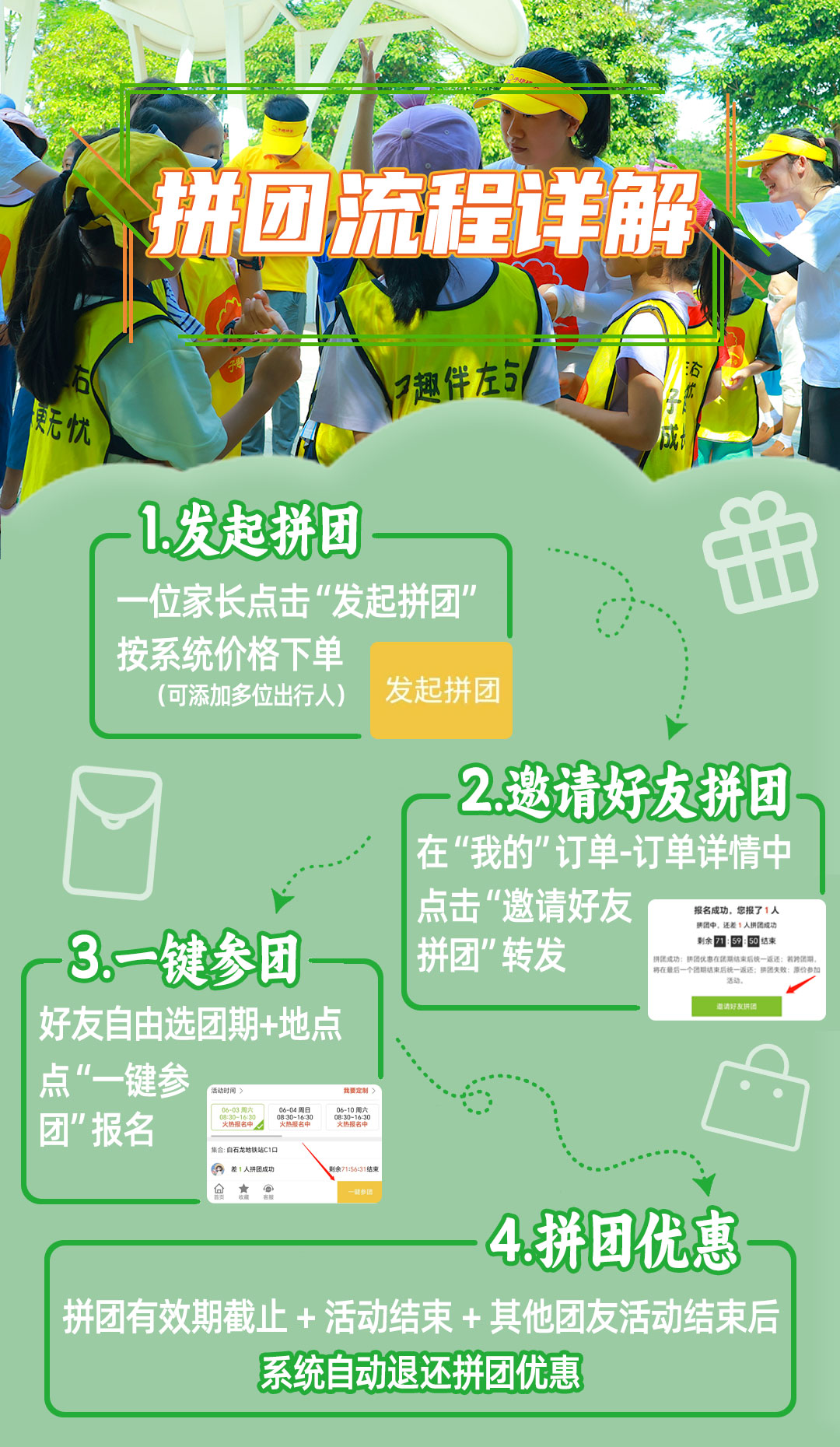 发起拼团:报名成功后,可以分享报名链接邀请好友报团;