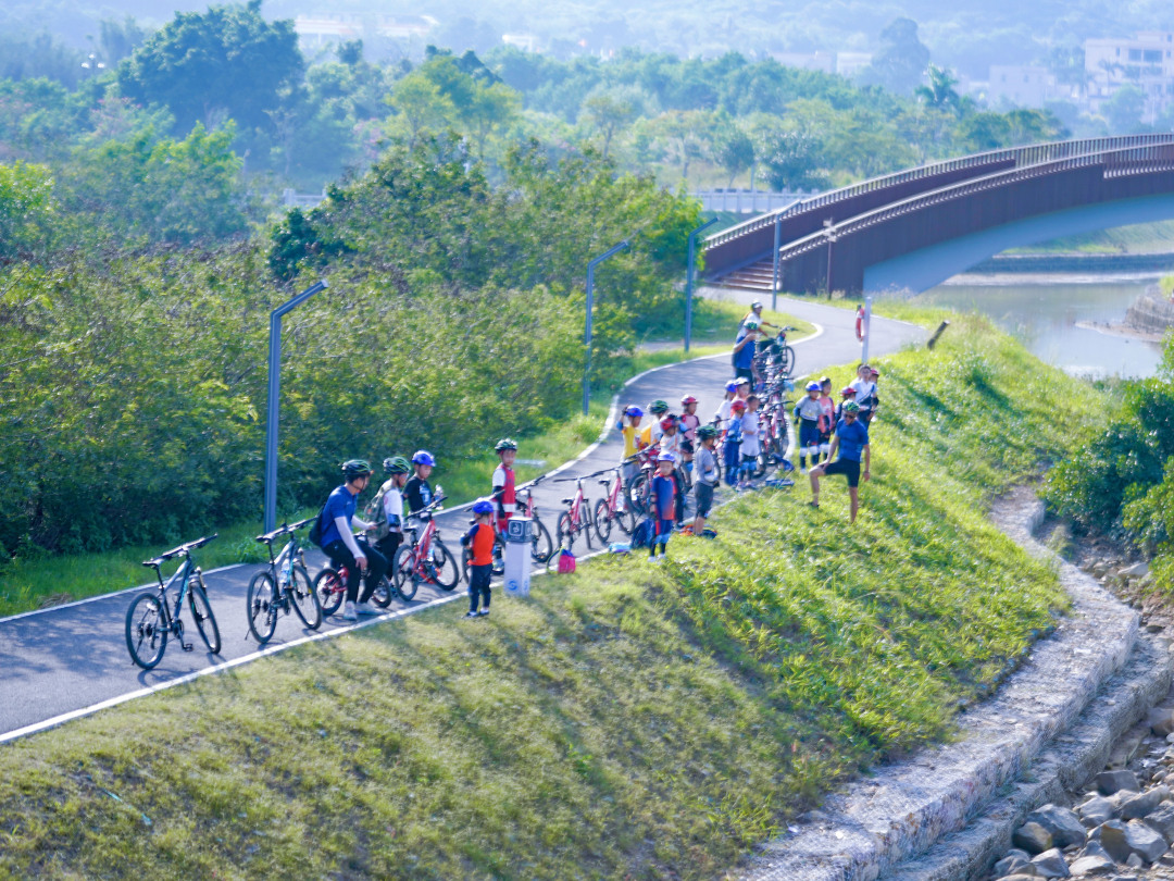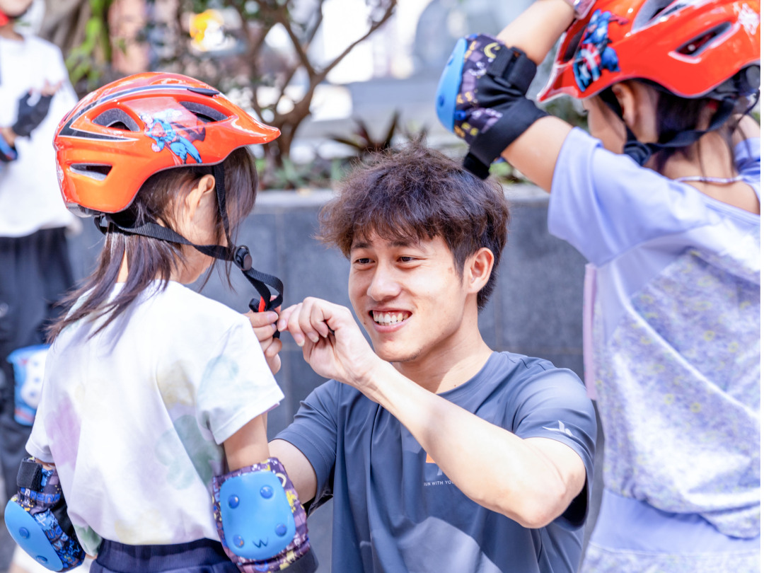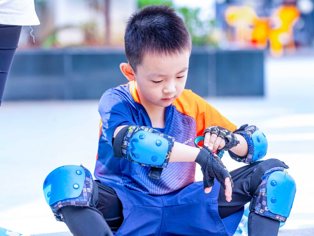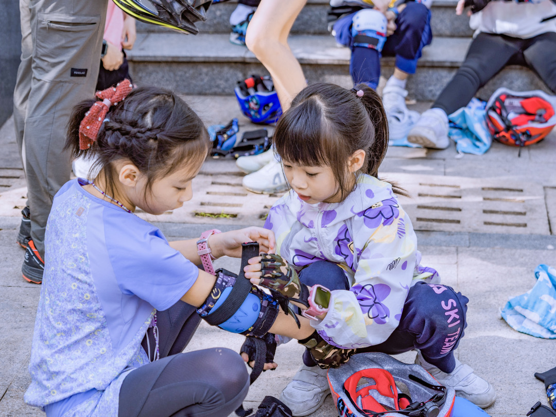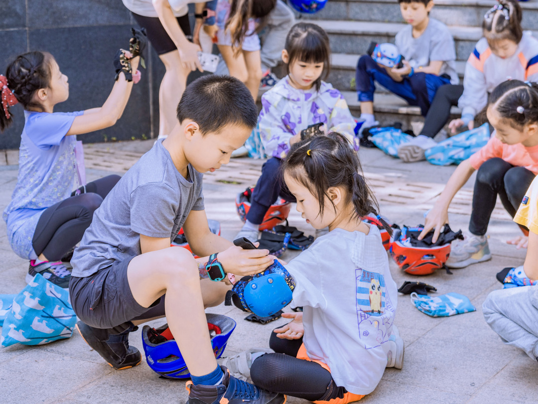 等待孩子们穿戴好护具,开始骑行